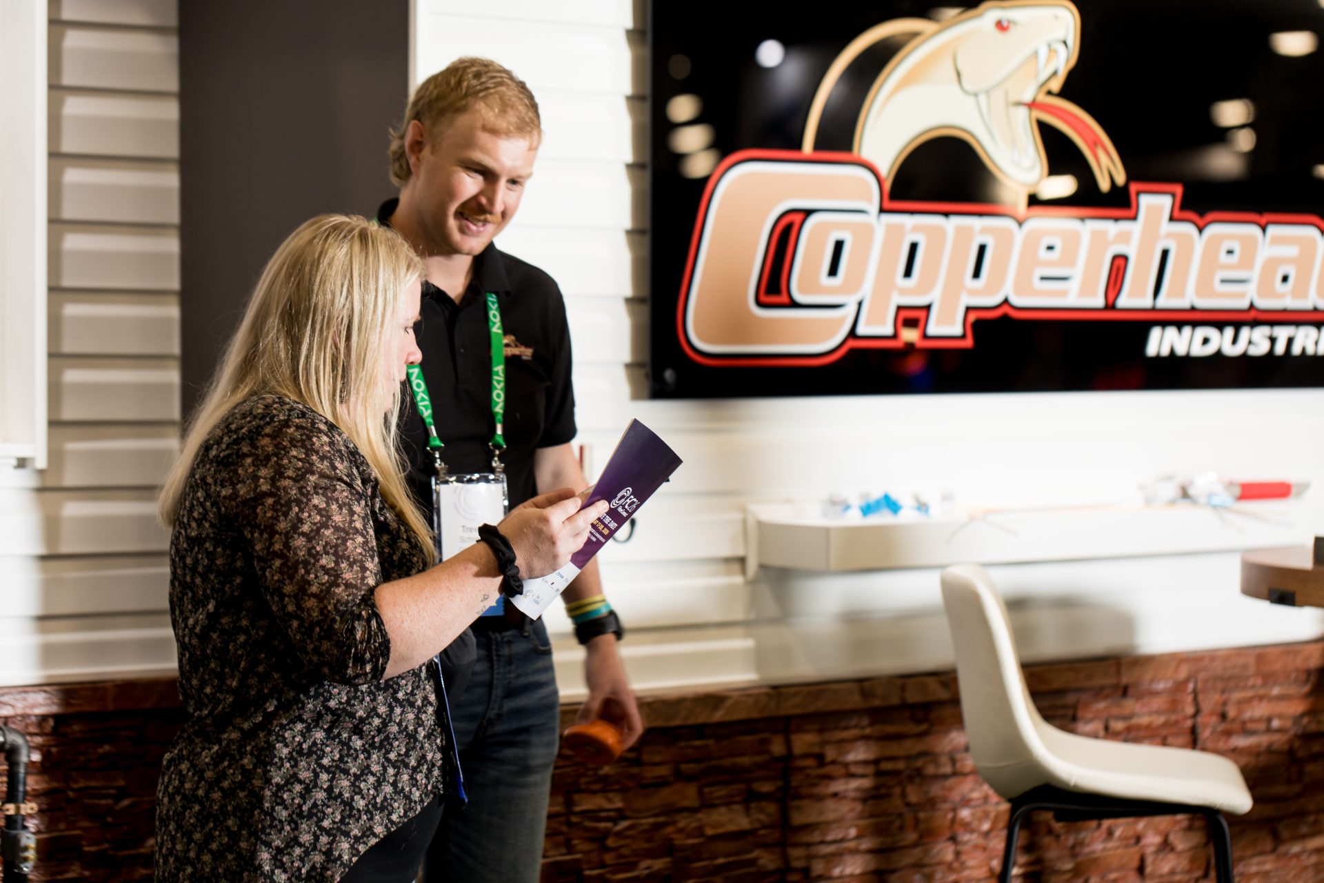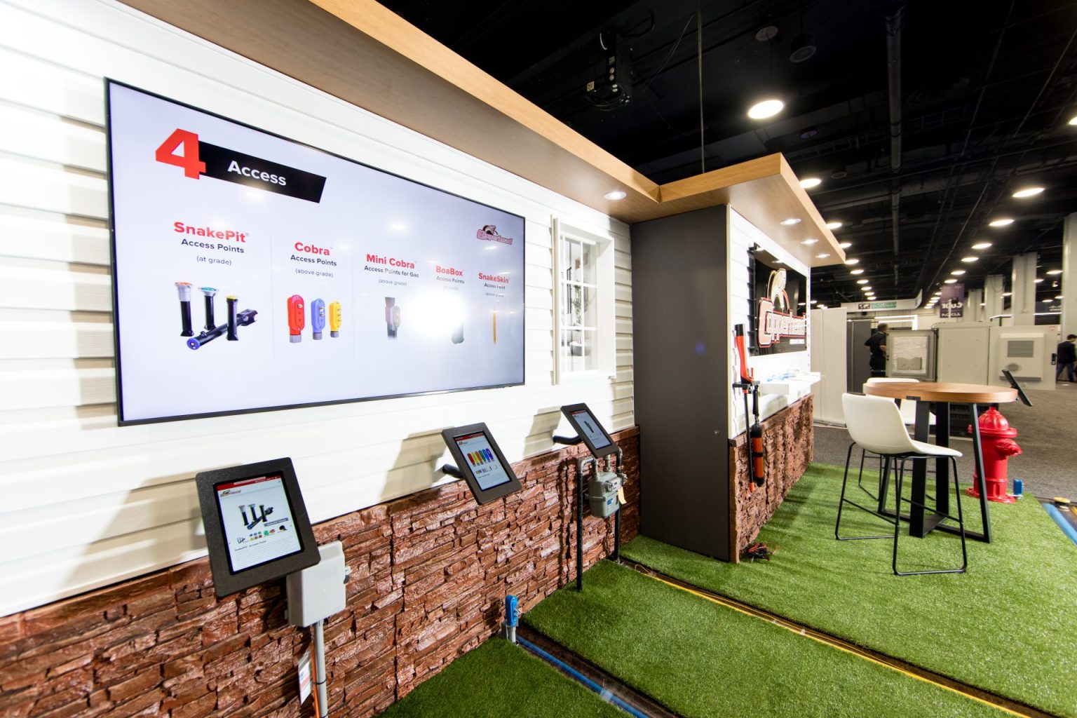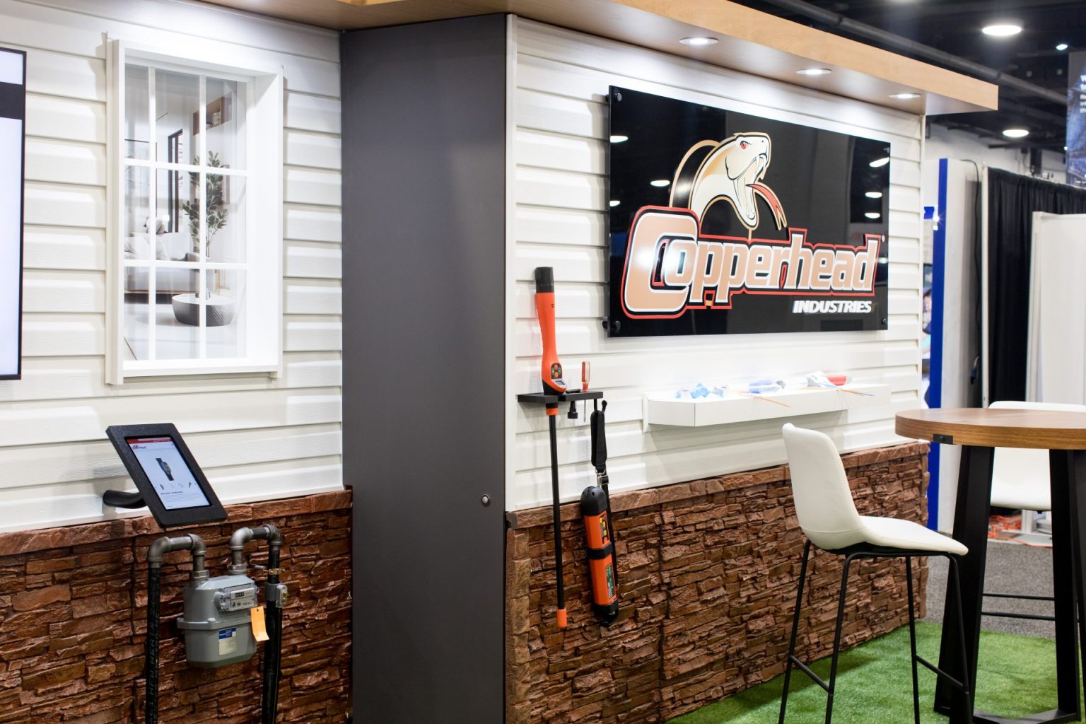 The new booth design overcame several challenges, including the need to demonstrate over 17 live Copperhead gas, water, and telecom products with fully powered, working loops in a compact 10×20 in-line space. It also prominently features the new Copperhead logo and website rebrand. The assets are durable and easily transportable for six plus shows per year and must be convertible to in-line, peninsula, or island configurations. The booth maintains an 8-foot height limit, while still incorporating storage, a casual meeting area, extra product display, and digital signage.