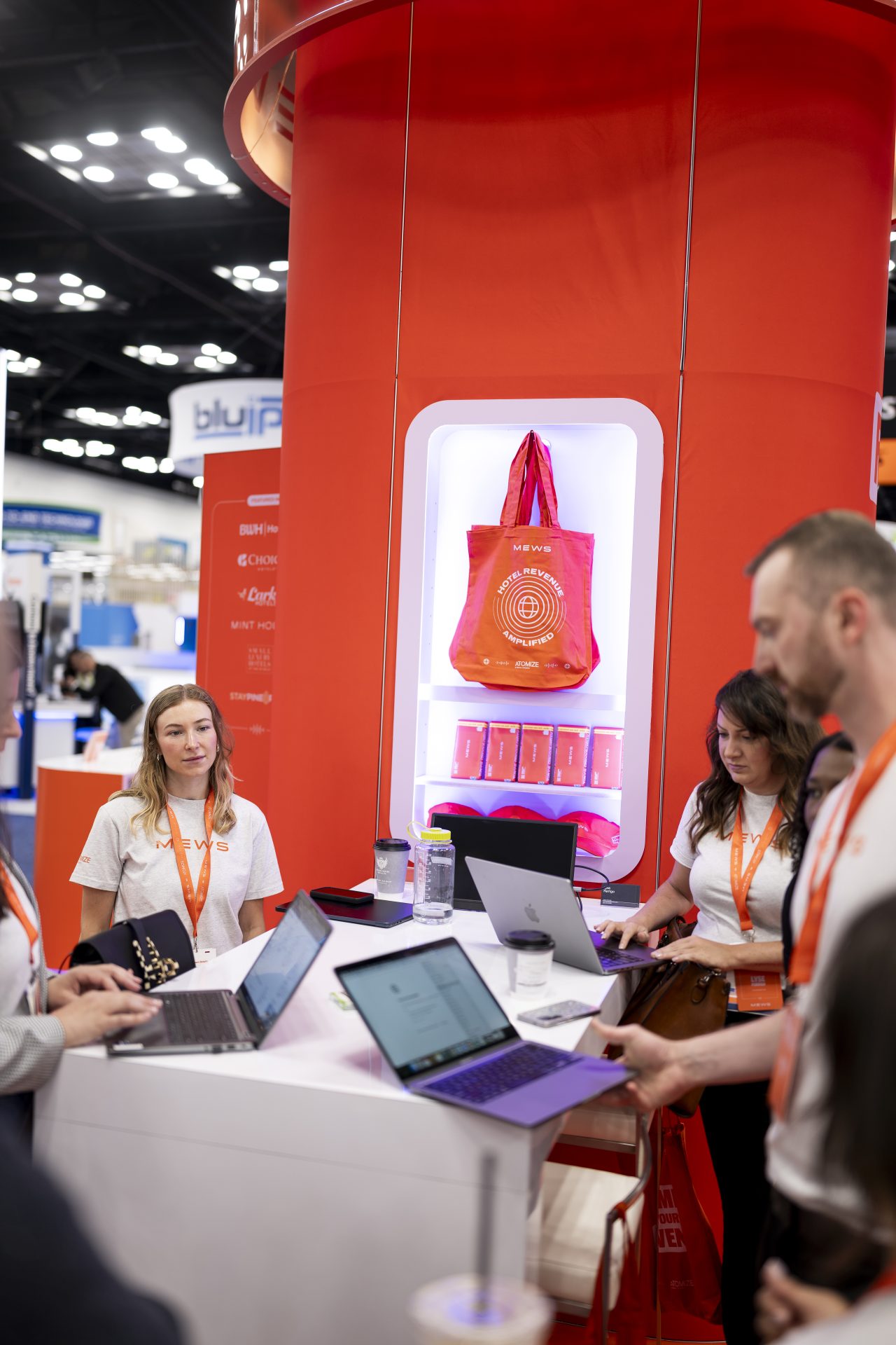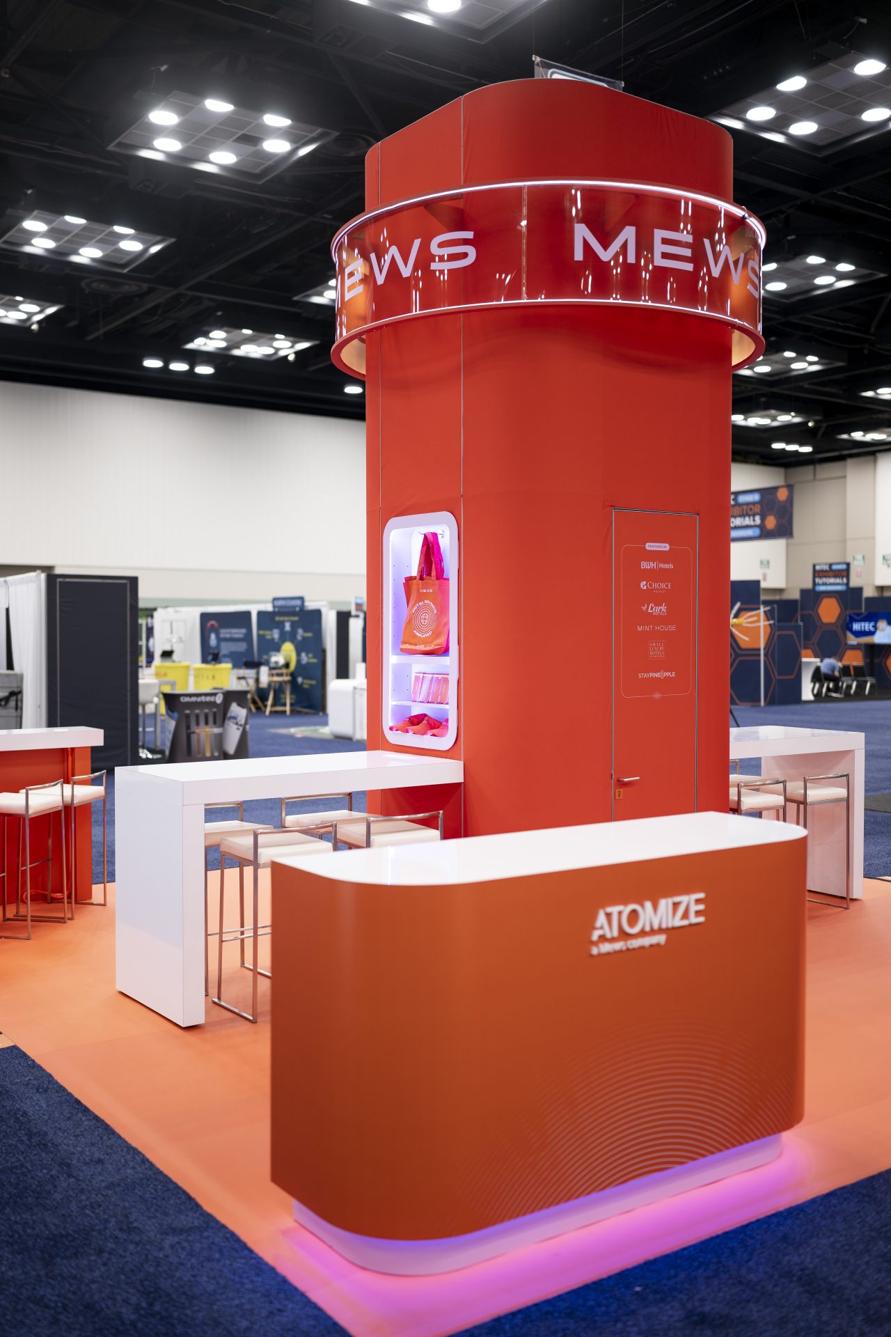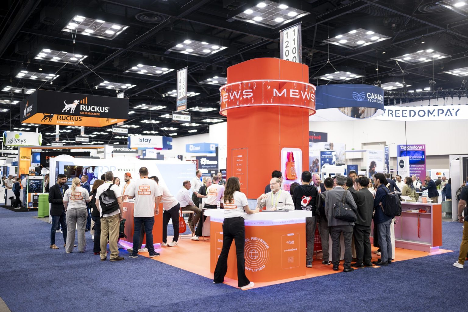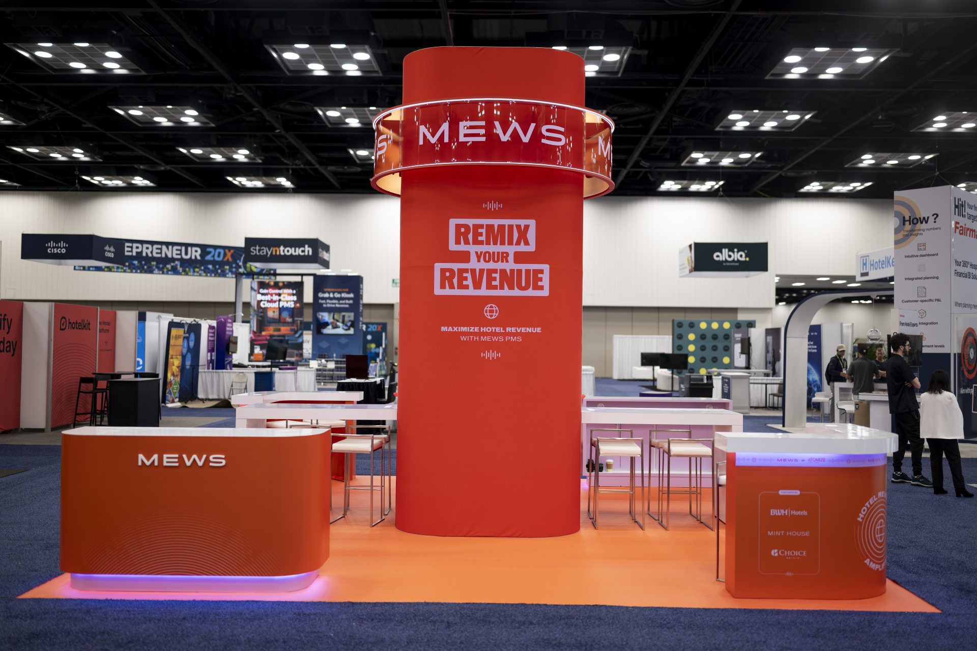 Harbor designed this vibrant and distinctive 20×20 booth for Mews Systems, creating an optimal environment to highlight their hospitality management system and engage with hoteliers, partners, and industry associations. Key features include a translucent LED logo sign, an illuminated merch display wall, convenient storage/closet space, demo counters, and custom printed and wrapped furniture, all designed to maximize networking opportunities.