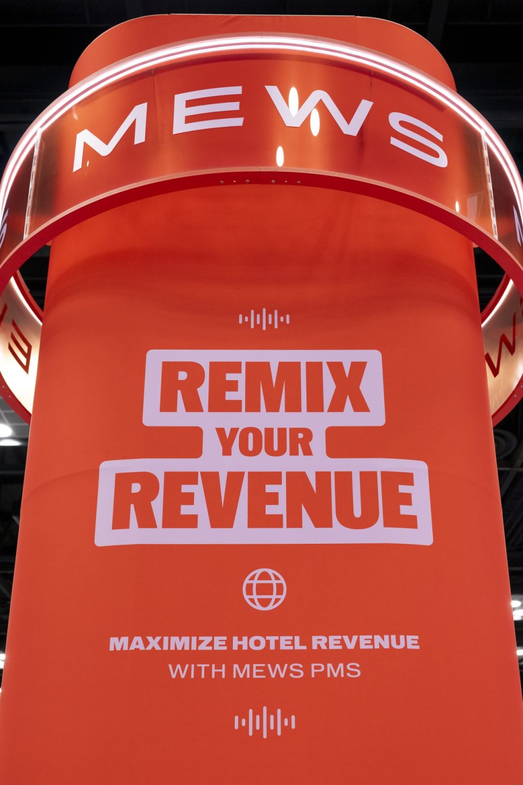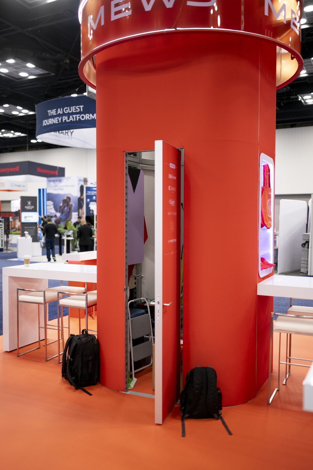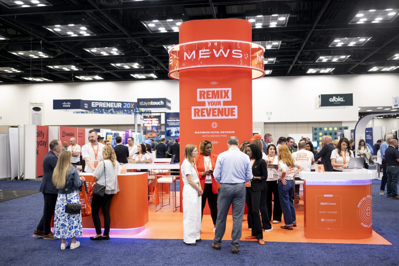 Harbor designed this vibrant and distinctive 20×20 booth for Mews Systems, creating an optimal environment to highlight their hospitality management system and engage with hoteliers, partners, and industry associations. Key features include a translucent LED logo sign, an illuminated merch display wall, convenient storage/closet space, demo counters, and custom printed and wrapped furniture, all designed to maximize networking opportunities.